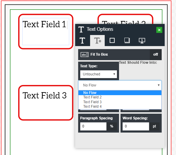 • Text Box Properties: In each page’s text box, set the Type to Variable and select the created variable.