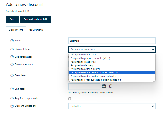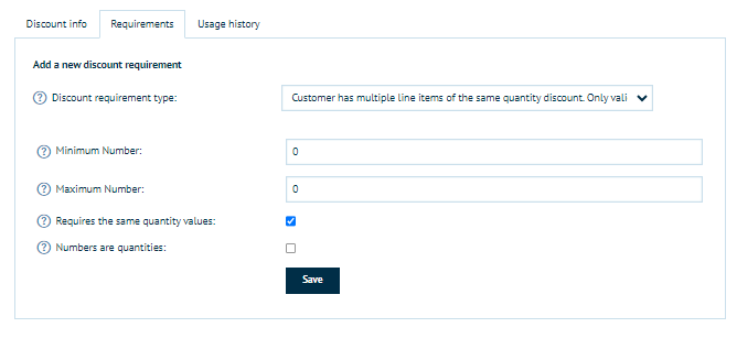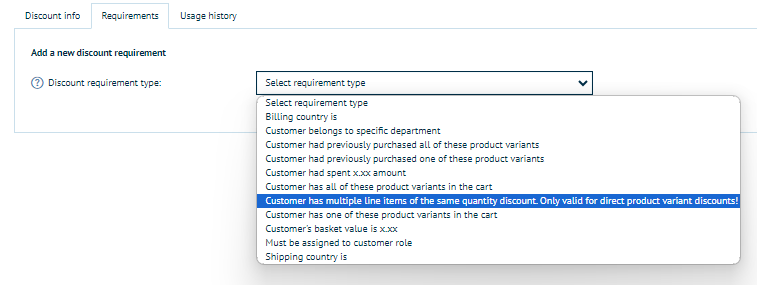 In addition to the discount types, the instances of when a discount can be further applied is controlled through specific requirements. You can set multiple requirements per discount.