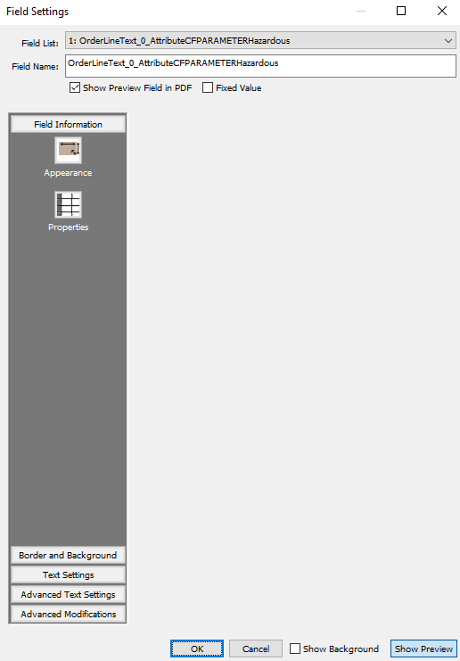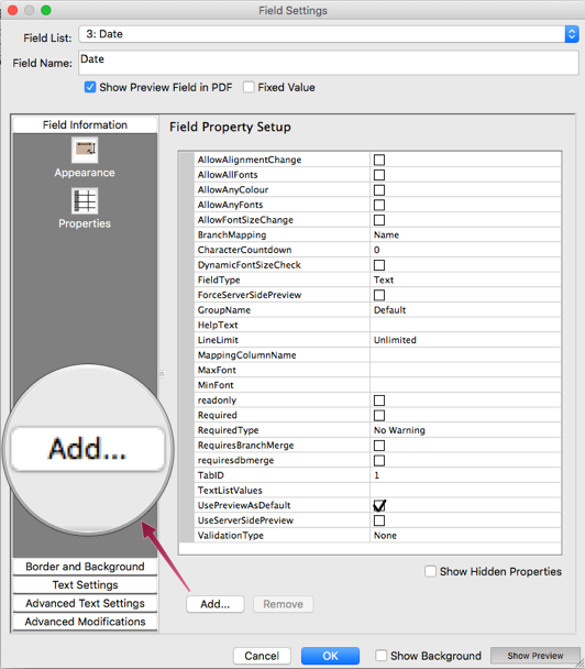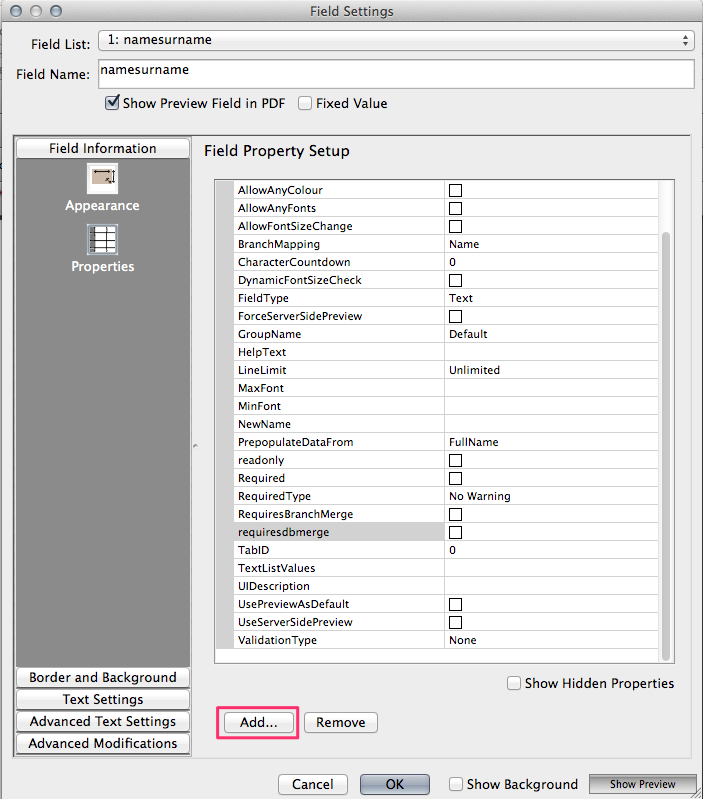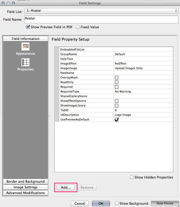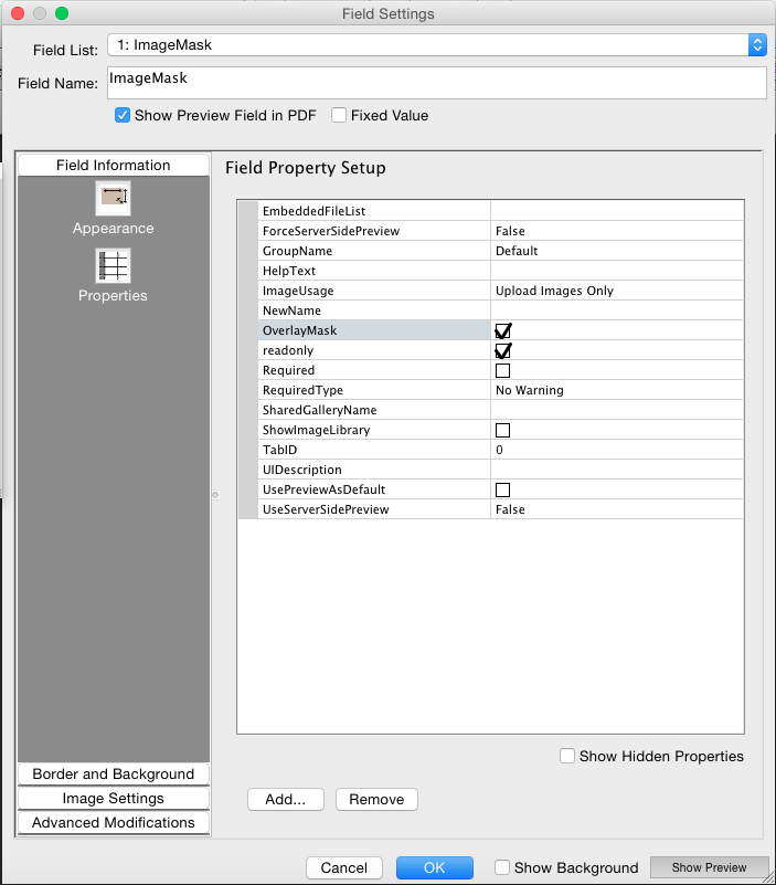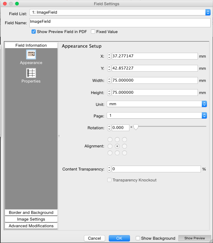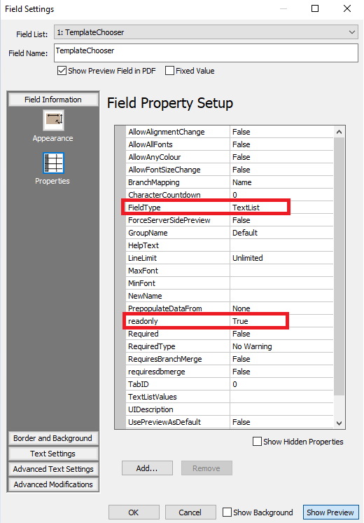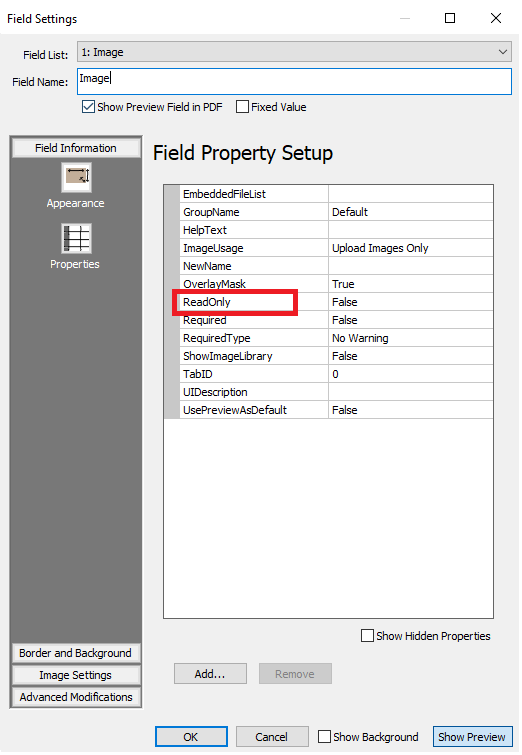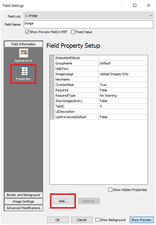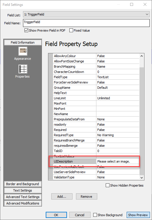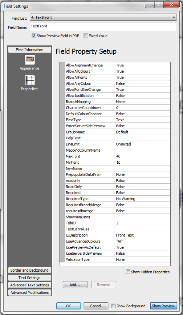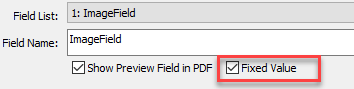 You do not need to do anything special with these fields' configurations and properties, as this will mostly be driven by the script. However, you will need to ensure that the names are appropriate and can easily be remembered when producing the script, so take note of what you have called each field after creating it. I have also made the image field a Fixed Value so that the user cannot change it within the editor (however the script will still be able to edit this as it will bypass this property).