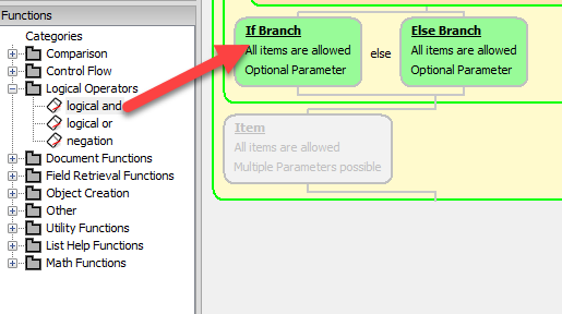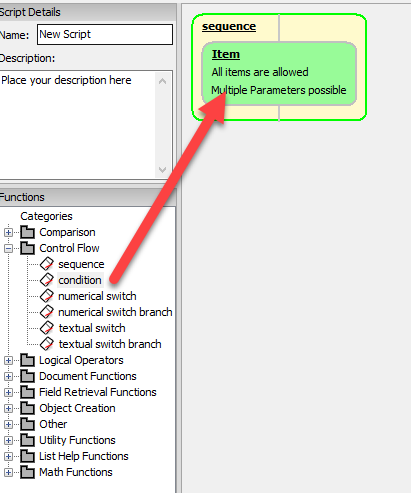 To add the condition, you will need to expand the Control Flow folder in the Functions menu on the left, and then drag the world Condition into the green Item box in the grey area, which will result in the screenshot below.