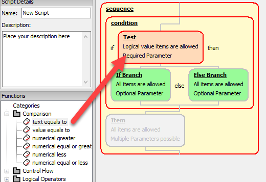 To achieve this, we will need to now collapse the Control Flow folder, and instead expand the Comparison folder. After this, we will need to drag the text equals to value over to the Test section of the condition. Doing so will result in the screen seen in the screenshot below.