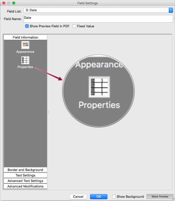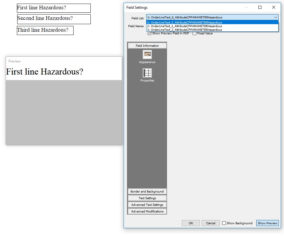 As you can see in the screenshot below, I have created the first field off of the artwork in the PDF, and the second and third fields on it. This is because I do not want my users to see a field which is only used for the script, and creating it off of the artwork will allow the script to still use the field without the users seeing it. I have highlighted the script field in blue so you can more clearly see its location.