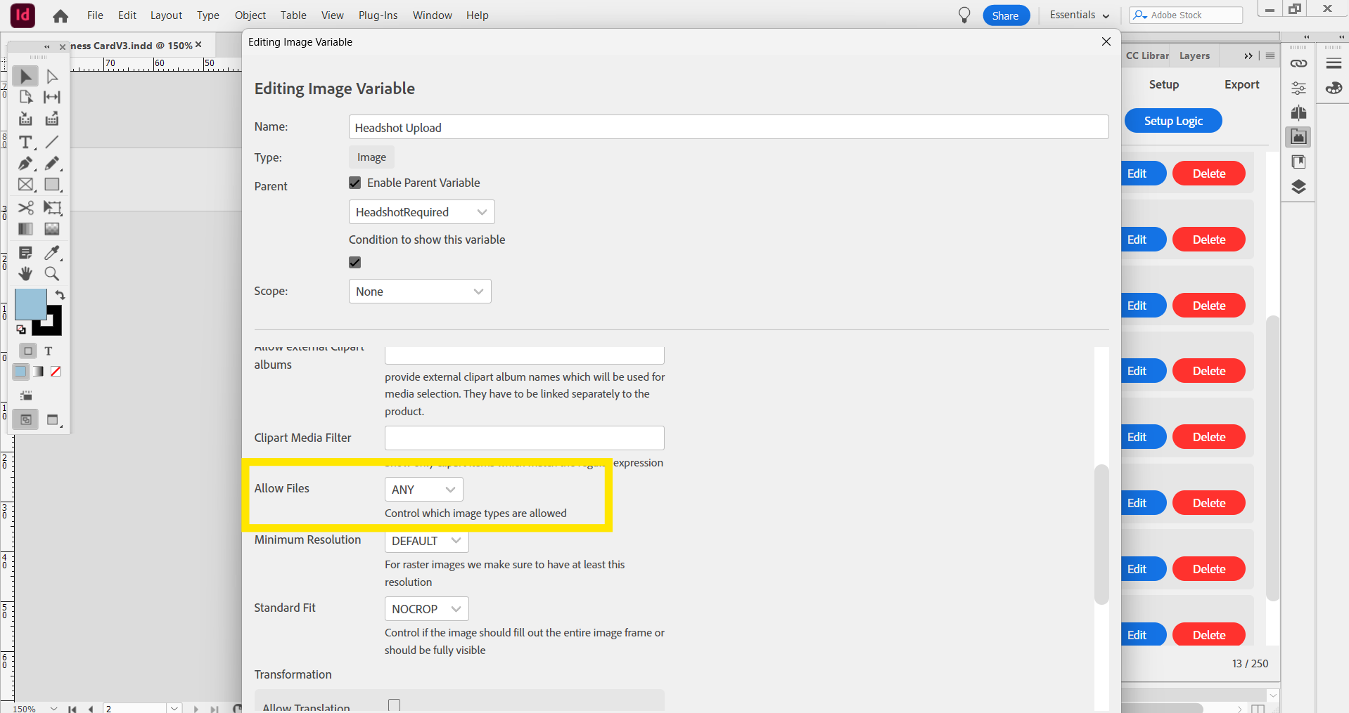 We also need a Clipart Resource set that will contain all the logo options the customer can select from that will be linked to both the logo variables.